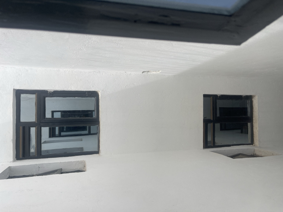 The image depicts an interior architectural space within a building located in Thika, Kenya. The scene features uniformly white, textured walls, suggesting a light well, stairwell, or internal courtyard. Natural light illuminates the area, casting subtle shadows on the wall surfaces. Two dark-framed windows are prominently visible on the left wall: a larger, rectangular window with multiple panes in the upper section, and a smaller, rectangular window below it. Both windows exhibit strong reflections of internal architectural elements, including other dark-framed windows or doorways and white walls, creating a recursive visual effect within their glass panes. A partial view of a third dark-framed window or opening is visible along the far right edge of the frame. On the upper left wall, an irregularly shaped opening or recess with a dark interior is present. No individuals, specific objects beyond the building's structural components, or discernible actions are observed within the frame.