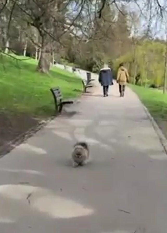 A tan and gray Pomeranian runs toward the camera on a gray sidewalk in a park. Two people walk away from the camera in the distance. There are trees on either side of the sidewalk. Benches are spaced along the left side of the path. There is a grassy slope on the left and water on the right. A tree branch is visible at the top of the frame.