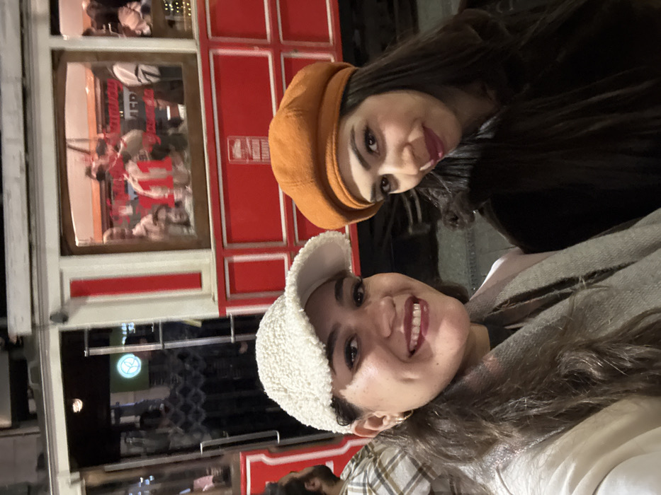 Two women pose closely for a photo, likely a selfie. The woman in the foreground smiles, wearing a fluffy white baseball cap and a plaid shirt peeking beneath a gray shawl. The other woman, positioned behind and to the side, wears an orange beret. Behind them, the background features a red structure, possibly a tram, with windows reflecting a brightly lit interior and a circular logo. The scene suggests an urban setting at night.