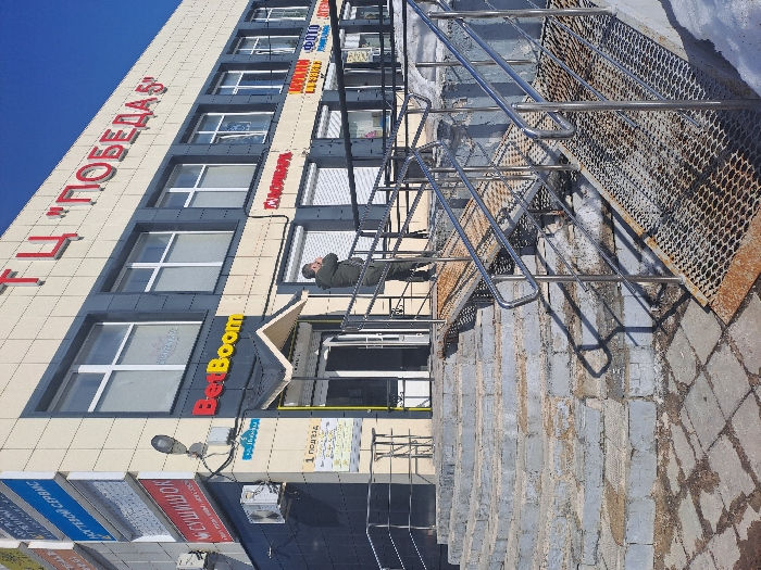 The image displays the exterior of a commercial building, specifically "Shopping Center 'Pobeda 5'" located at Lenin Street, 1A, in Yegoryevsk, Russia. The two-story building features a facade of beige and dark grey panels under a clear blue sky. Large red letters spelling "ТЦ 'ПОБЕДА 5'" are affixed to the top floor. Below, a prominent "BetBoom" sign, in red and yellow, marks a central entrance. Additional business signs for "Nail Service" and "Sushishok" are visible on the building's left corner. Access to the main entrance is facilitated by a wide, worn set of concrete stairs and, to their right, two parallel, rusted perforated metal ramps with shiny chrome handrails. Patches of snow and ice are present on the ramps and along the base of the structure, indicating cold conditions. One individual, wearing a dark-colored hooded jacket, stands on the paved landing at the top of the stairs and ramps. This person is positioned facing to the right, with their left hand raised to their ear, consistent with being engaged in a phone call. Strong sunlight casts distinct shadows from the railings and building across the entry area.