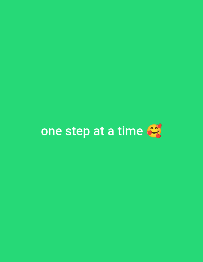 The image depicts a solid, vibrant green background. Centered horizontally, white sans-serif text reads "one step at a time." Immediately to the right of this text, a yellow emoji is present, characterized as a smiling face with three red hearts encircling it. No discernible physical location, individuals, subjects, objects, actions, interactions, or environmental features are depicted within this graphic image. The city of Los Chacos, Venezuela, is not visually represented or implied.