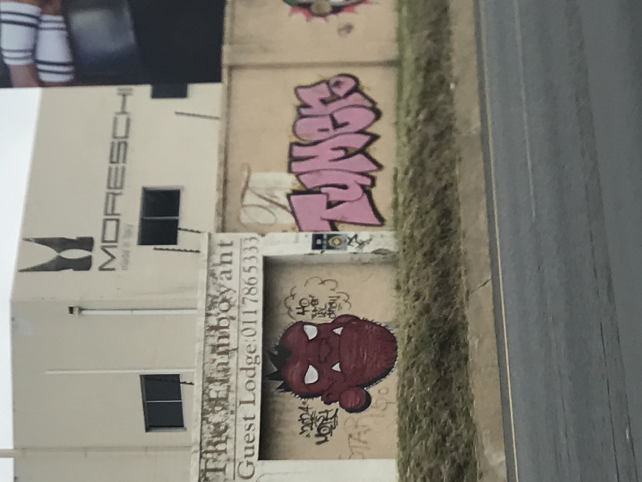 The image depicts a roadside scene in Kramerville, Sandton, Johannesburg, South Africa, under an overcast sky. In the background, a light-colored commercial building displays a dark, stylized "M" logo above the text "MORESCHI made in Italy." Security spikes are visible along a lower section of this building's facade. In the midground, a concrete wall runs parallel to the street. The left portion of this wall bears faded lettering identifying "The Flamboyant Guest Lodge: 0117865333." Below this text, a large red graffiti character with fangs and spiky hair is painted on the wall, accompanied by smaller text tags. To the right, another prominent piece of graffiti spells "TUMER" in pink bubble letters with dark outlines. A section of a large billboard, showing an arm with white and black striped bands, is partially visible on the far right beyond the Moreschi building. Separating the wall from the roadway is a narrow verge of dry, brownish grass. In the immediate foreground, an asphalt road with a yellow lane marker stretches across the bottom of the frame. No individuals are visible in the scene.