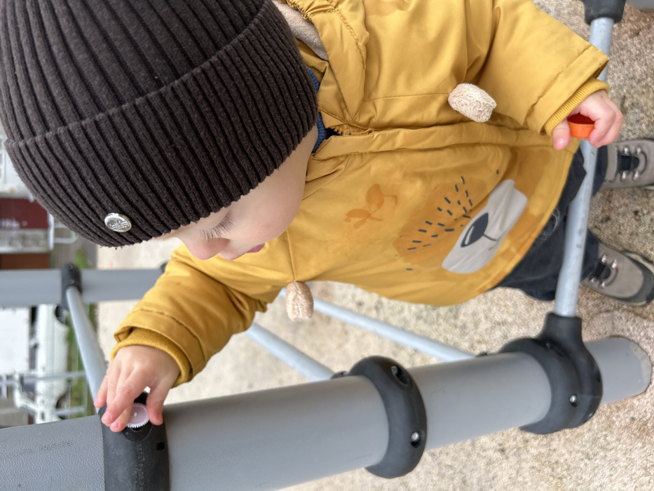 A toddler in a brown beanie and yellow jacket stands beside a grey metal structure. The jacket features a light-colored animal graphic and fuzzy detailing. The child is touching a small, white knob on the metal structure with their left hand. The structure has black fittings and appears to be part of a shopping cart or similar device. The child's shoes are visible in the background. The ground appears to be concrete.