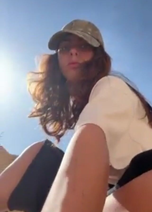 A young woman with long, wavy brown hair and wearing a camouflage baseball cap, a white t-shirt, and black shorts, is filming herself climbing down a rocky hillside. She's looking directly at the camera, and the view is from her perspective. The environment appears to be a desert or canyon with light-colored rock formations. At one point she gets close to the edge of a drop with water below, and she sticks her tongue out.
