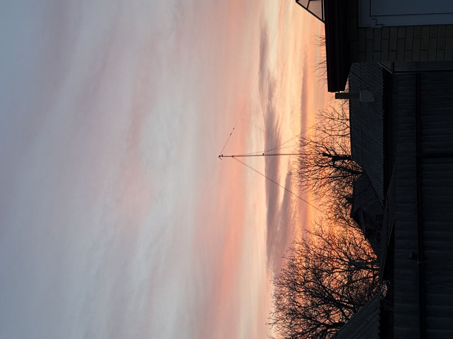 The image depicts an outdoor scene in Makiivka, Ukraine, at either sunrise or sunset. The sky dominates the upper two-thirds of the frame, transitioning from a light blue-grey at the zenith to vibrant pink, orange, and golden hues towards the horizon, interspersed with horizontal cloud streaks. Silhouetted against the bright sky, a dense canopy of bare deciduous trees occupies the mid-ground, showing intricate branch patterns. Below the trees, several dark, sloping roofs constructed from corrugated material are visible. A prominent, slender metal mast or antenna structure, potentially a radio antenna, stands upright, extending above the treeline and some rooftops, with multiple wires or elements radiating outwards. On the far right, a section of a light-colored brick building is visible, featuring a dark brown roof with a distinct, angular skylight or architectural element, and a partial view of a white door or garage panel. A small, cylindrical chimney is present on one of the darker roofs. A dark, slatted wooden fence forms the base of the immediate foreground. No people or active subjects are present in the scene.