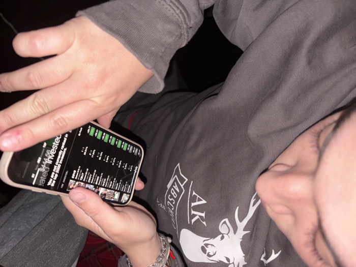 A person looks at a phone screen displaying a stock market app, "eated Invested," with green up arrows indicating positive stock performance. The text on the screen indicates the user isn't in the top 2000 investors. The person wears a gray hoodie with a deer graphic and gray sleeves. A silver bracelet is visible on the wrist of the hand holding the phone.