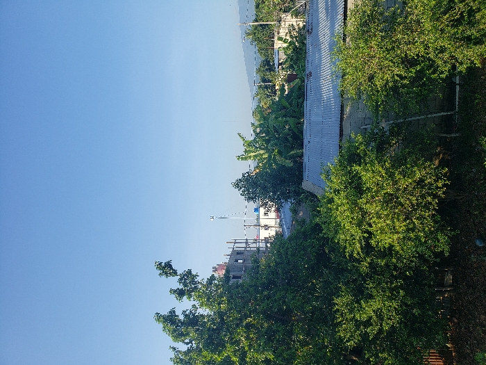 The scene is taken from a residential area in El Córbano, Dominican Republic, at the coordinates 18.809 latitude and -71.252 longitude. There are several trees and houses in the foreground, with a clear blue sky in the background. There is a building under construction in the distance, partially obscured by trees. The roof of a house with a corrugated metal roof is in the center of the scene. Some trees are in the foreground, and there is a fence to the right of the image. The scene is taken from a higher angle, providing an overview of the area. There are no people visible in the image.