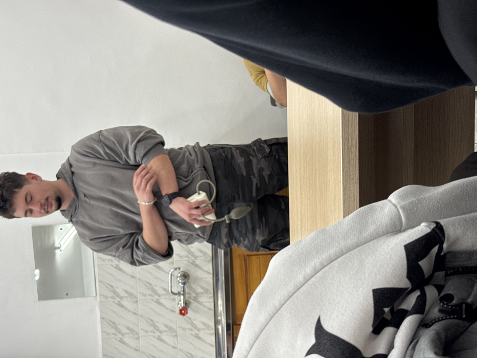 An interior scene in Sofia, Bulgaria, displays a young adult male standing, facing slightly left, against a white wall with a section of white tiled wall to his left. The male has short dark hair and light facial stubble. He is dressed in a grey hooded sweatshirt, camouflage cargo pants, a dark digital watch on his left wrist, and a light-colored beaded bracelet. He holds a white medical cuff and a dark rubber bulb, components of a sphygmomanometer, in his left hand, while his right hand rests on his left forearm. His eyes are closed. Behind the male, affixed to the tiled wall, is a sink with two distinct faucets (one with a red handle) and a small, rectangular mirror mounted above. A wooden countertop is visible beneath the sink. In the foreground, a light-colored wooden table extends across the lower part of the frame, partially obscuring two seated individuals. The individual on the far left wears a light-colored hoodie with dark, irregular patterns, and the individual on the right wears dark clothing.