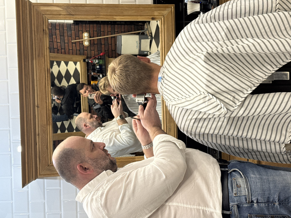 A bald man in a white shirt stands in a barber shop, reflected in a large mirror. He's trimming the hair of a customer wearing a striped cape. In the mirror's reflection, two men are seen taking pictures with their phones, capturing the scene. The barber shop features a black and white checkered wall and brickwork in the mirror's background. The mirror has a wooden frame.