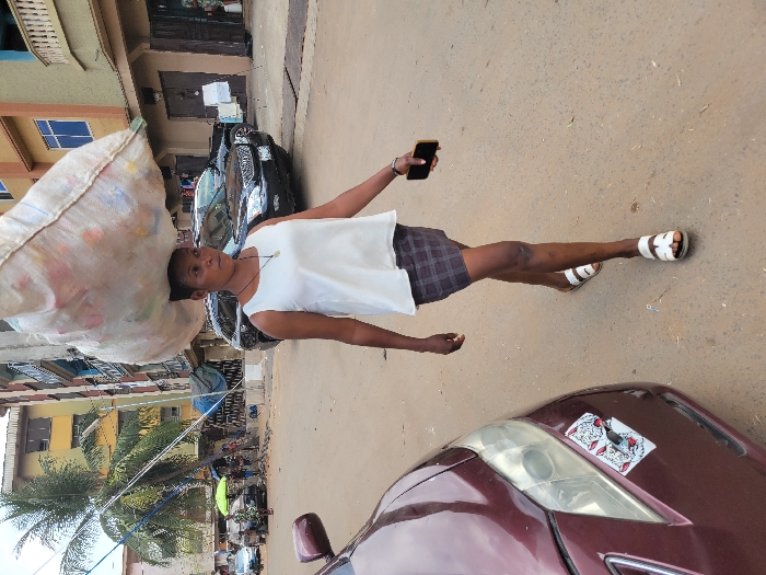 An outdoor street scene in Onitsha, Nigeria, features a female pedestrian walking towards the viewer's right on a paved road
