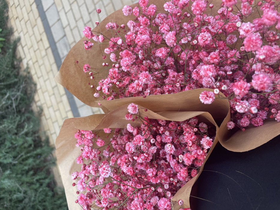 - "Two bouquets of bright pink Gypsophila flowers, each wrapped in plain brown craft paper, are held by an unseen individual" by FM-VN4T93, licensed under CC BY 4.0