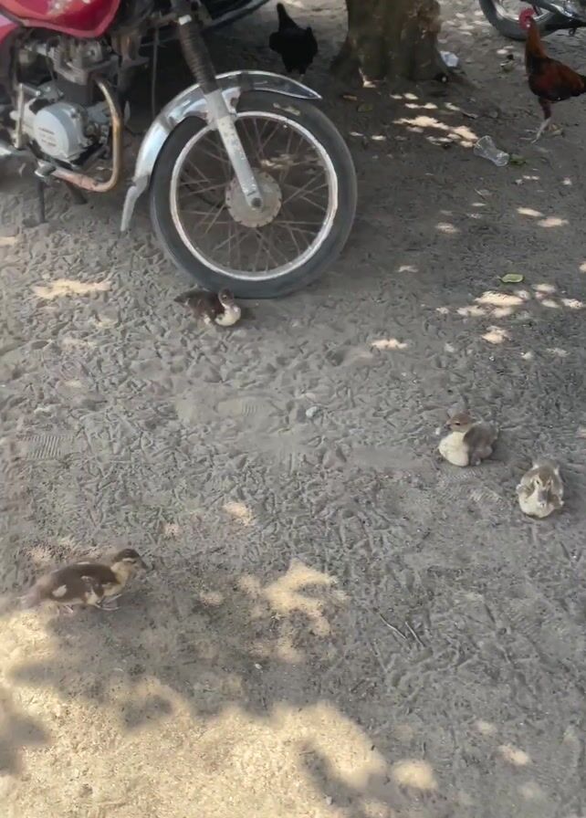 collection of ducklings and a hen in a dirt yard. The ducklings are various shades of brown and appear to be newly hatched. A black-and-white hen stands nearby, presumably their mother. A rooster walks around them. Several motorcycles are parked around the dirt yard near a tree.