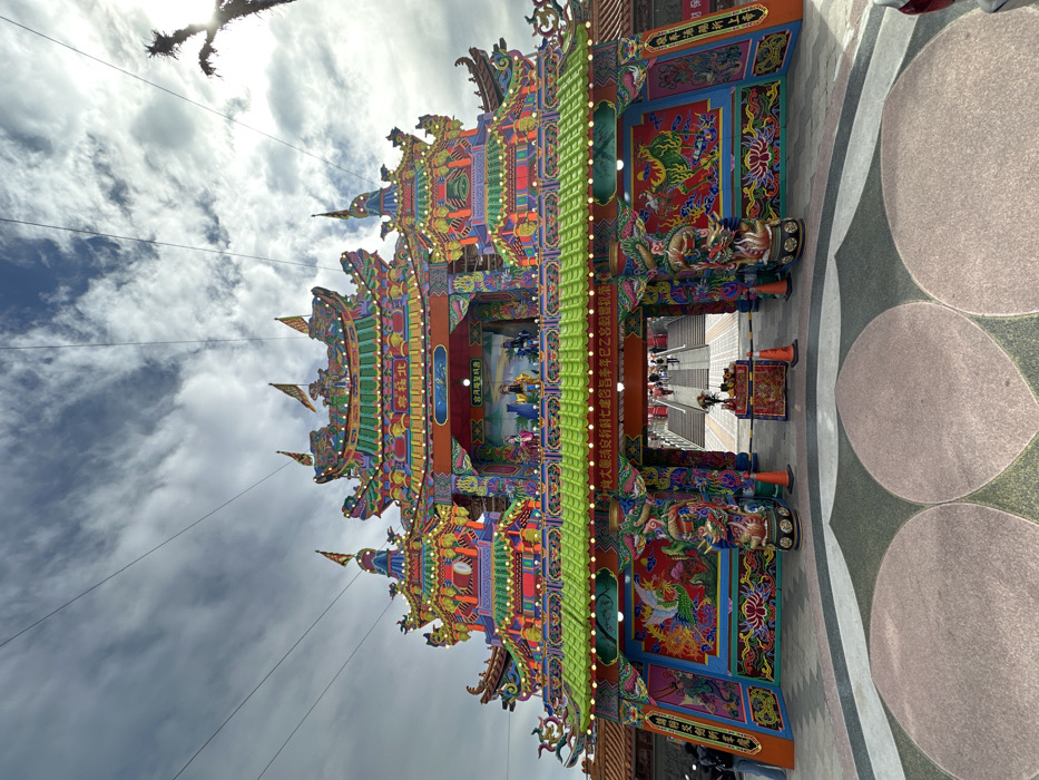 A vibrant, multi-tiered Taiwanese temple gate stands beneath a cloudy sky. The gate is adorned with intricate carvings and colorful decorations, including dragons and phoenixes. Strings of lights line the structure, and small flags protrude from its various levels. A pathway leads through the gate, revealing steps and figures in the distance. The ground surrounding the gate is paved with circular patterns. Chinese characters are visible on the gate's pillars.