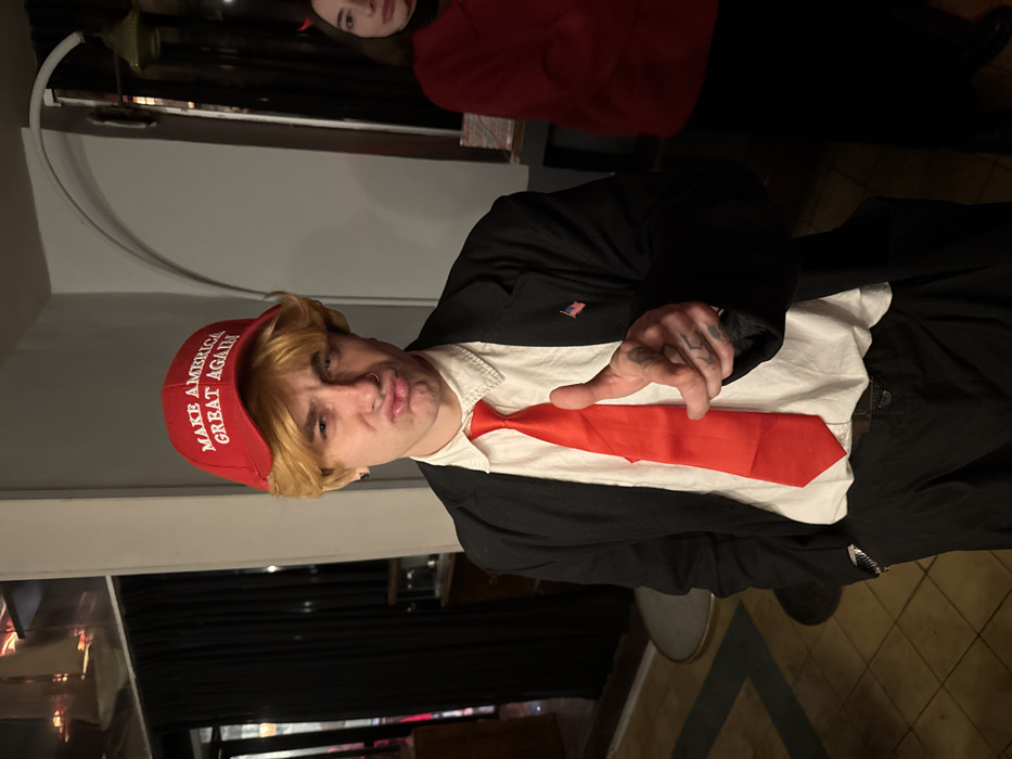 An interior photograph displays a light-skinned male, positioned centrally and facing the viewer. He wears a blonde wig and a red baseball cap emblazoned with "MAKE AMERICA GREAT AGAIN" in white text. His attire includes a white collared shirt, a red tie, a black suit jacket featuring a miniature American flag pin on the left lapel, and dark trousers. His right hand, displaying visible knuckle tattoos, is extended towards the viewer with the index finger pointed, while his left hand rests in his pocket. He exhibits a facial expression characterized by pouted lips and a furrowed brow. Visible facial piercings include a nose ring and an earring in his left ear. Partially visible on the right side of the frame, behind the male subject, is a light-skinned female with dark hair, adorned with red horn-like headwear and a red garment. The background includes dark drapery and indistinct reflective surfaces to the left, and a plain light-colored wall with a curved white fixture to the right. The floor is covered in patterned tiles. The exact location within Tel-Aviv, Israel, cannot be ascertained from the visual data present in the image.