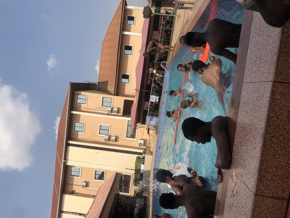 Several people are swimming in an outdoor pool. A tan-colored building stands beside the pool. The sky is blue with some clouds. A sign is visible by the pool's edge, and a Heineken banner hangs near the building. Some of the swimmers are dark-skinned and appear to be young. They are enjoying their time in the water. The pool's edge is tiled.