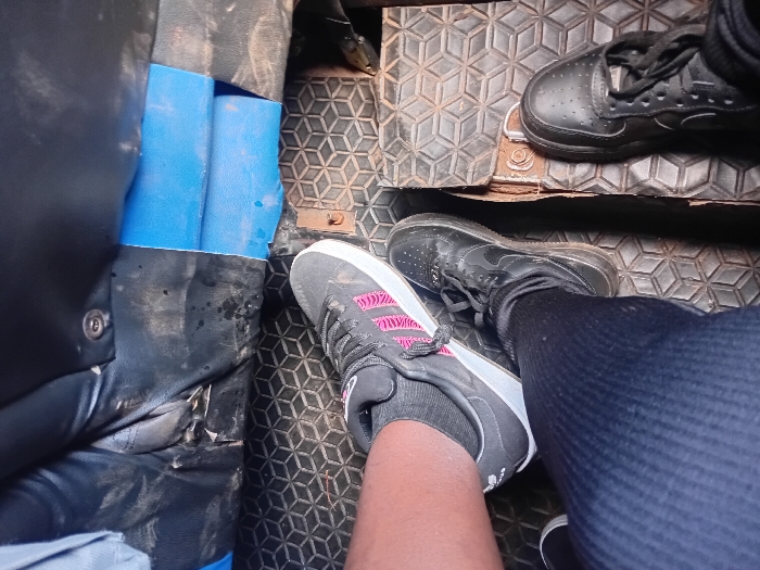 The image displays the lower portion of what appears to be a crowded vehicle interior. Three feet wearing shoes are visible. One foot is clad in a gray Adidas sneaker with pink stripes. The other two feet are in black Nike Air Force 1 sneakers. The floor has a geometric, three-dimensional pattern. A dirty, worn seat with blue padding is also present. The overall impression is cramped and potentially dirty.