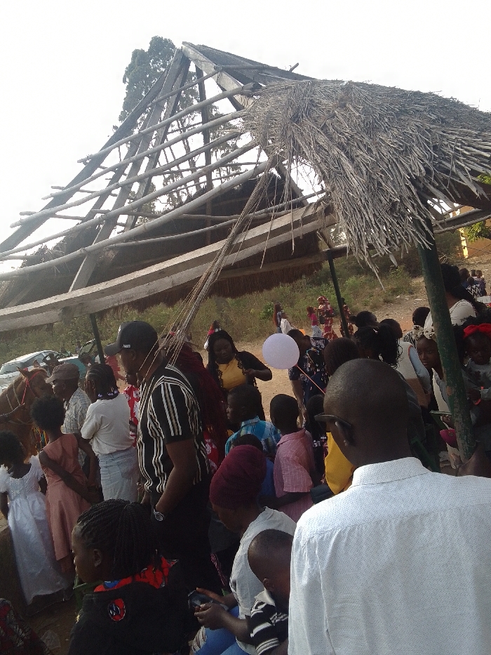 Underneath a large, ramshackle structure of weathered wood and thatch, a crowd gathers. Many appear to be children, some in formal attire. A horse stands near the left edge of the frame. A woman in a yellow top holds a white balloon. Another individual wears a black and white striped shirt and a baseball cap. The back of a man in a white shirt dominates the foreground, obscuring some of the scene. The sky is overcast, adding to the muted color palette.