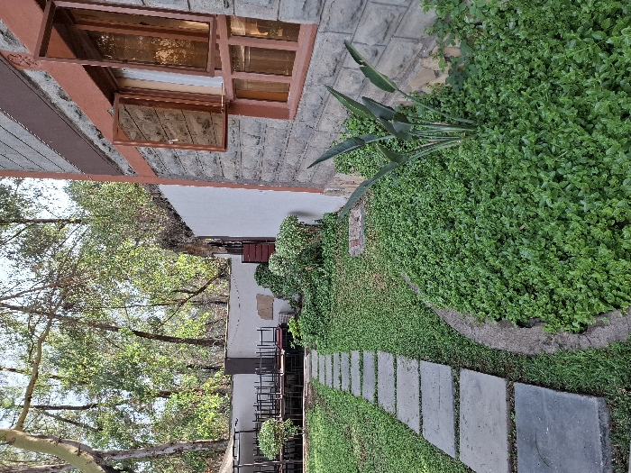 stone pathway leading to a stone building with a window. The building is located in a residential area in Karagita, Kenya, a suburb of Nairobi, located at latitude: -0.754, longitude: 36.438. The pathway is lined with a dense patch of green grass and foliage on either side. The building has a stone facade with an orange trim around the window, which is open and contains a windowpane with a wooden frame. The yard is neat and well-maintained, featuring a few shrubs and trees. There are no people present.
