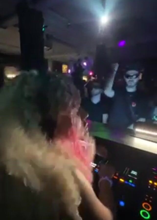 The scene shows a DJ performing in what appears to be a nightclub or party venue. The DJ, who has distinctive light-colored, curly hair with pink highlights, is standing behind a DJ console, operating the equipment. In the background, there are several people, some of whom are facing the DJ and appear to be dancing or enjoying the music. A man with sunglasses is visible, giving a wave. There's stage lighting illuminating the space. The setting seems to be a lively, dark environment.