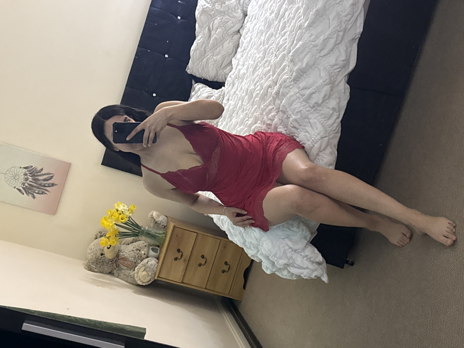 The image displays an indoor bedroom scene, captured as a mirror reflection. A female individual with long, dark hair is seated on the edge of a bed, holding a smartphone in her right hand to take a selfie, which obscures her face. She is wearing a short, red, lace-trimmed slip dress and is barefoot, with her legs extended onto a light brown carpeted floor. The bed features a dark, upholstered headboard with button tufting and white, textured bedding. To the left of the bed, a light brown wooden three-drawer chest holds a large, light brown teddy bear with a striped bow tie and a clear vase containing yellow daffodils. A framed artwork depicting a dreamcatcher with feathers hangs on the light-colored wall above the chest. The specific location within Great Yarmouth, United Kingdom, is not discernible from the visual information presented.