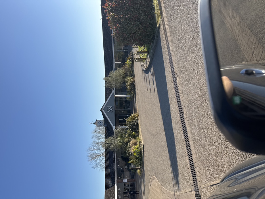 The image depicts the front entrance of the Stoke by Nayland Hotel, Golf & Spa, located in Stoke-by-Nayland, within the district of Babergh, United Kingdom. The scene is illuminated by clear sunlight, casting long shadows across the asphalt driveway, suggesting a morning or late afternoon timeframe. The perspective is from a dark-colored vehicle, with its side mirror visible in the lower right foreground, showing a green indicator light in its reflection. The main building is a multi-section structure featuring a dark tiled roof and extensive glass windows. A central gray facade marks the entrance, displaying a prominent light-colored "SN" logo. Above this, a small clock tower houses a circular clock face and is topped with a weathervane. To the left of the main entrance, a sign on the building clearly reads "Golf Club." One individual in dark clothing is partially visible standing or walking on the far left, near the "Golf Club" sign. The driveway leading to the entrance is composed of asphalt with integrated paved sections and a metal drainage grate running horizontally across the mid-ground. Landscaped areas and planters containing various shrubs, small trees, and flowering plants are positioned around the building's base and within the driveway's curving layout. Wooden posts with ropes form a barrier along the edge of the driveway to the right.