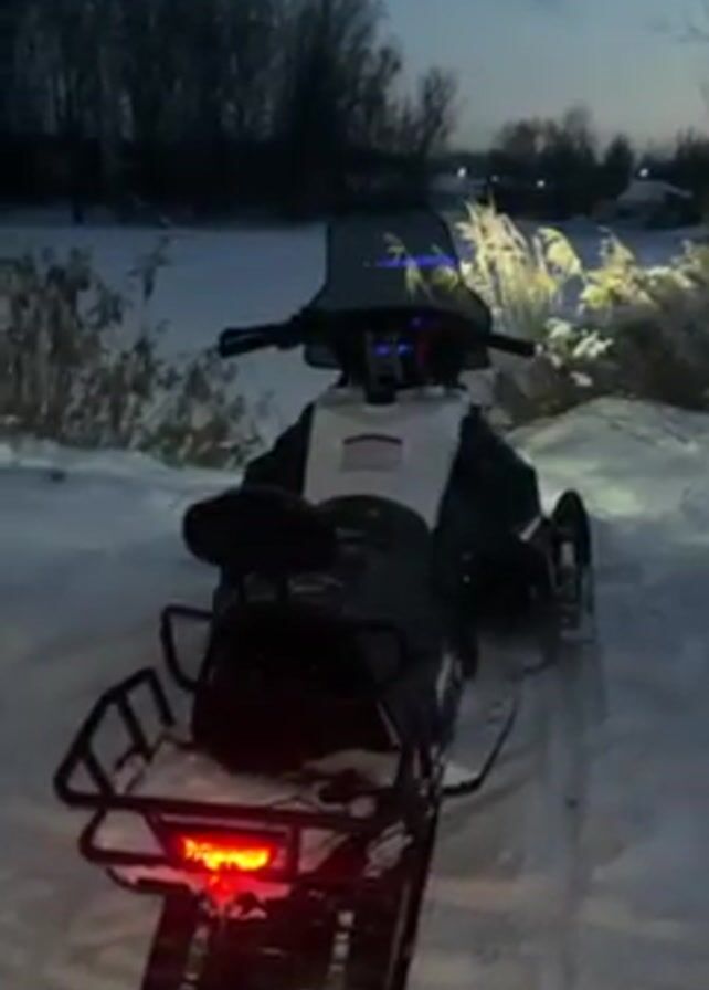 snowmobile parked in a snowy field. The snowmobile is white and black, with a windshield, handlebars, a seat, a rear rack, and a track. The snowmobile's headlight and taillight are on. The background of the video shows a snowy field with some trees and bushes. It appears to be early morning or evening.