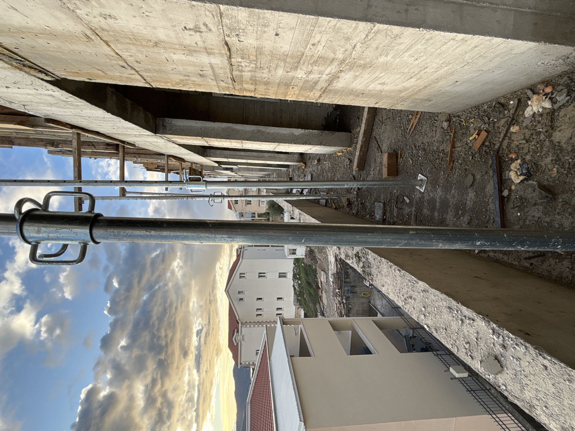 The image displays an active construction site in Kavač, Montenegro, viewed from an elevated perspective. The immediate foreground shows a rough, grey concrete surface littered with construction debris including concrete fragments, broken bricks, and wood pieces. Several vertical metal scaffolding props, some featuring U-shaped handles, are positioned along the concrete edge, extending towards the background. To the right, a large, unpainted concrete wall with visible formwork patterns runs parallel to the viewer, featuring multiple rectangular openings revealing internal wooden bracing. In the midground, to the left, a partially completed or recently finished multi-story building with light beige exterior walls and a light red corrugated roof is visible, displaying several balconies. Below this building, a construction excavation or graded area contains disturbed earth and a coiled yellow hose, bordered by a black metal fence. Further into the midground, a white residential building with multiple windows and a red tiled roof stands on a vegetated slope. The background features distant hills under a partly cloudy sky, characterized by blue patches, white clouds, and a golden-orange hue near the horizon. No individuals are present in the scene.