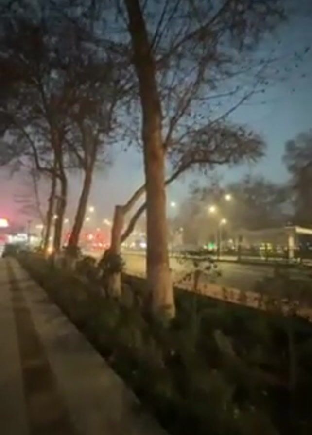 The camera moves slowly along a sidewalk next to a road at dusk. Bare trees line the sidewalk, and a narrow strip of low shrubs and grass separates the sidewalk from the road. On the road, cars are driving and streetlights illuminate the scene, creating a hazy glow. Across the road, there is a bus stop and some buildings in the distance. The sky is a gradient of dark blue to light gray.