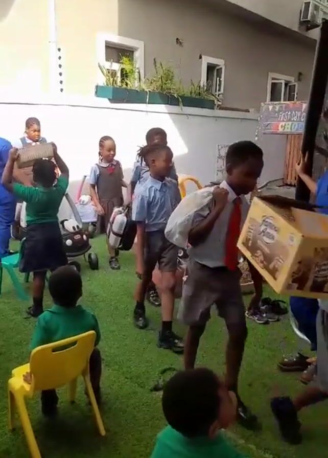 group of young children in school uniforms carrying items across a grassy yard. Several children are walking while carrying baskets, boxes, and a suitcase, while others are sitting on yellow plastic chairs. One child balances a basket on their head. The yard is enclosed by a gray building and a fence. A sign that says "First Day of..." is partially visible in the background. Some of the children are wearing green shirts and dark skirts or shorts, while others wear blue button-down shirts and gray shorts or skirts, with some wearing vests and ties. The scene appears to be outdoors, with sunlight visible.