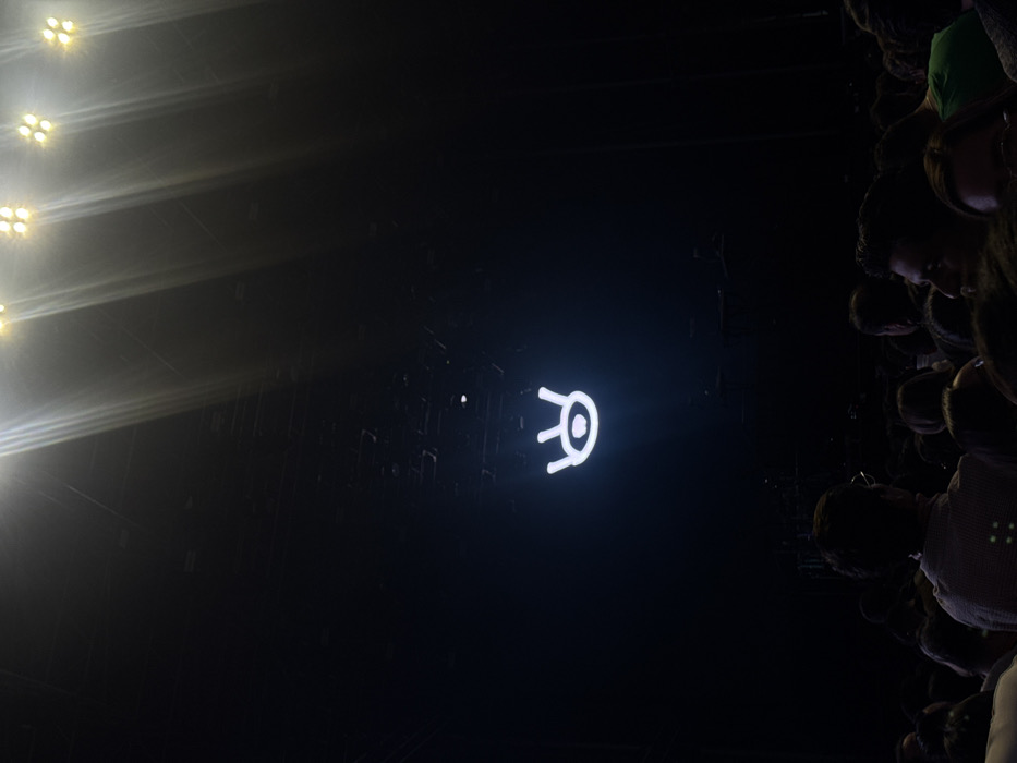 A dimly lit concert scene displays a crowd to the right. On the left are stage lights. In the center is a white logo or symbol that appears to be a stylized eye with antenna-like extensions. The overall impression is that the image was taken during a performance or event.