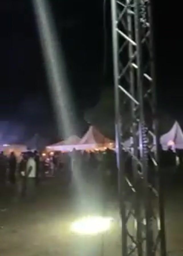 The video depicts an outdoor night scene with multiple white tents set up. Several people are visible, dressed in casual clothing, milling around and walking between the tents. There is a metal structure on the left side of the frame that appears to be a lighting tower. Bright spotlights illuminate the area and scan the crowd, with beams extending upwards into the night sky. The ground appears to be grassy. The overall atmosphere suggests a festival or outdoor event at night.