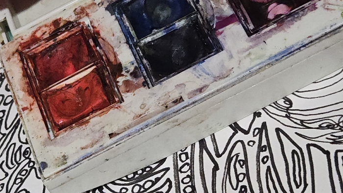 - "A well-used, rectangular watercolor palette sits diagonally over a patterned background" by FM-0J88a2, licensed under CC BY 4.0