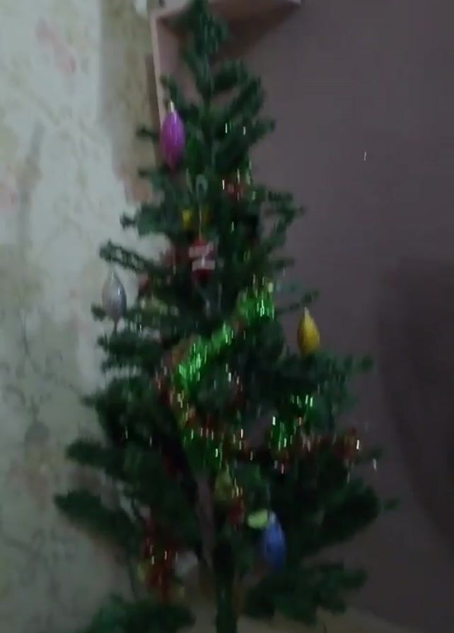 small, decorated Christmas tree and a vase of decorative flowers. The Christmas tree is green and decorated with colorful ornaments and tinsel. It is positioned in the corner of a room with light-colored wallpaper featuring a floral pattern. A small shelf is mounted on the wall above the tree. The vase of flowers contains decorative branches and artificial flowers, and is placed in front of the same floral wallpaper. A framed photograph is also placed within the vase. The camera moves between focusing on the Christmas tree and then panning to the vase of flowers.