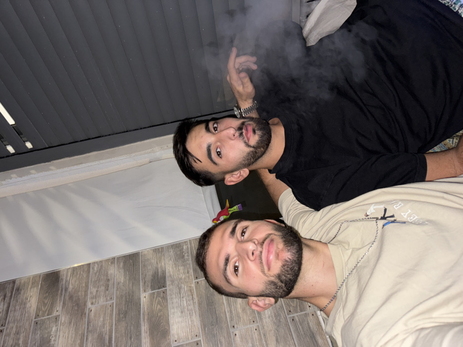 Two males are captured in an indoor or semi-enclosed outdoor space, possibly a balcony or patio, within the city of Holon, Israel. The male on the left, facing forward with a slight smile, wears a light beige t-shirt with a graphic design and a silver-colored chain necklace. He has short dark hair and a trimmed beard. His left arm is resting on the right shoulder of the second male. The male on the right, also facing forward, wears a black t-shirt and a metallic wrist watch on his left arm, which is raised and bent. He has short dark hair, a trimmed beard, and a neutral expression. A plume of white smoke, consistent with vaping or smoking, is visible emanating from his right side, partially obscuring his lower right torso. The background on the left features a wall composed of horizontal light brown wood-like slats. Above the individuals, a white fabric canopy or awning is visible, with a small multi-colored object resembling a parrot figurine attached to it. To the right of the canopy, dark horizontal louvered blinds or shutters are present, suggesting an exterior boundary. The lighting is dim, indicating evening or night conditions.