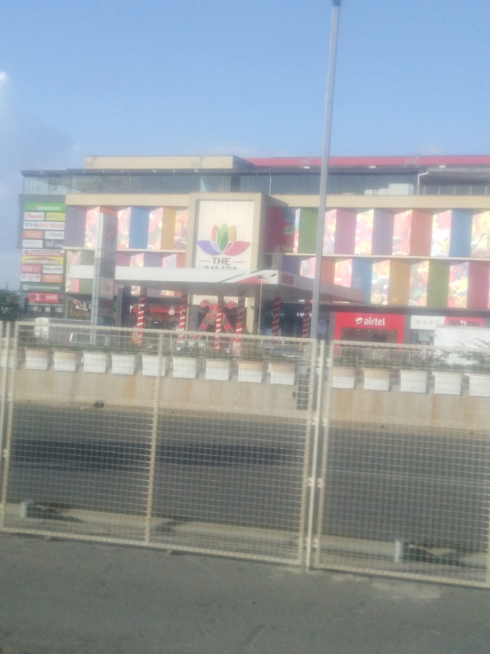 A multi-story commercial building, "The Maharaja," features a colorful facade with vertical panels. A gas station canopy, adorned with red and white striped decorations, is situated at the building's base. The Airtel logo is visible near the gas station. A concrete barrier with white planters lines the road, and a metal mesh fence separates the viewpoint from the building. The sky is pale blue and partially cloudy.
