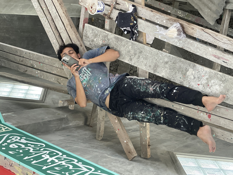In the city of Kumbang, Indonesia, a young adult male is observed lying supine on wooden scaffolding planks within a raw concrete building interior. He is barefoot and wears a light blue t-shirt and black sweatpants, both heavily splattered with multiple paint colors. His right hand holds a grey smartphone, equipped with visible camera lenses, directed towards himself. Adjacent to him on the scaffolding are a white plastic bucket, a hammer, a folded dark fabric item stained with paint, and a clear plastic bag containing several thin, pointed objects. A partially visible green and white Arabic calligraphy mural adorns the unpainted concrete wall to the left, and a glass block window is situated in the upper background.