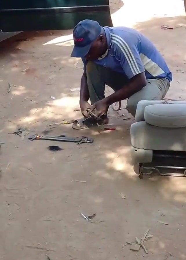 A man wearing a blue t-shirt, gray pants, and a blue cap with a white logo is squatting on a dirt surface and welding a metal component. He is using a welding torch that emits bright orange sparks. Near him is a disassembled car seat and a green car door. Scattered around are various tools and debris. The scene appears to be taking place outdoors, possibly in a car repair area.
