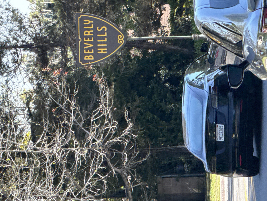 The image depicts a daytime street scene in Beverly Hills, Los Angeles County, California, United States