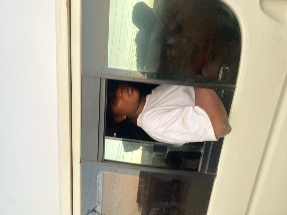 A person with dark skin and short, dark hair peers out of a partially open window. They wear a white t-shirt and their arm rests on the window frame. The window has dark tinted glass and reflects the outside environment. The surrounding frame is white or light gray. Outside the window, power lines and buildings can be seen, suggesting an urban or suburban environment.