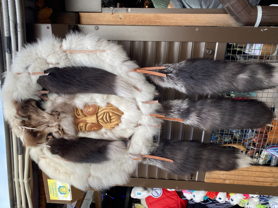 Displayed are several animal pelts arranged in a circular pattern, adorned with a wooden carving in the center depicting a stylized face. Each pelt has a distinctive tail, with colors ranging from white and brown to shades of gray and black. The tails are attached with small leather straps. The presentation is on a shelf or display structure, with various items visible in the background, including plush toys.