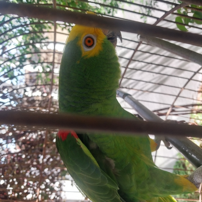 - "A green parrot with a yellow head sits inside a wire cage" by FM-zBmG82, licensed under CC BY 4.0