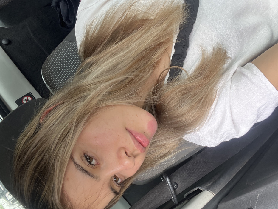 A woman with blonde hair and brown eyes poses indoors, likely in a car. She's wearing a white shirt and a seatbelt. Her skin shows a few freckles. The photo is taken from a high angle, tilting the view. The background includes a black headrest and textured car seat.