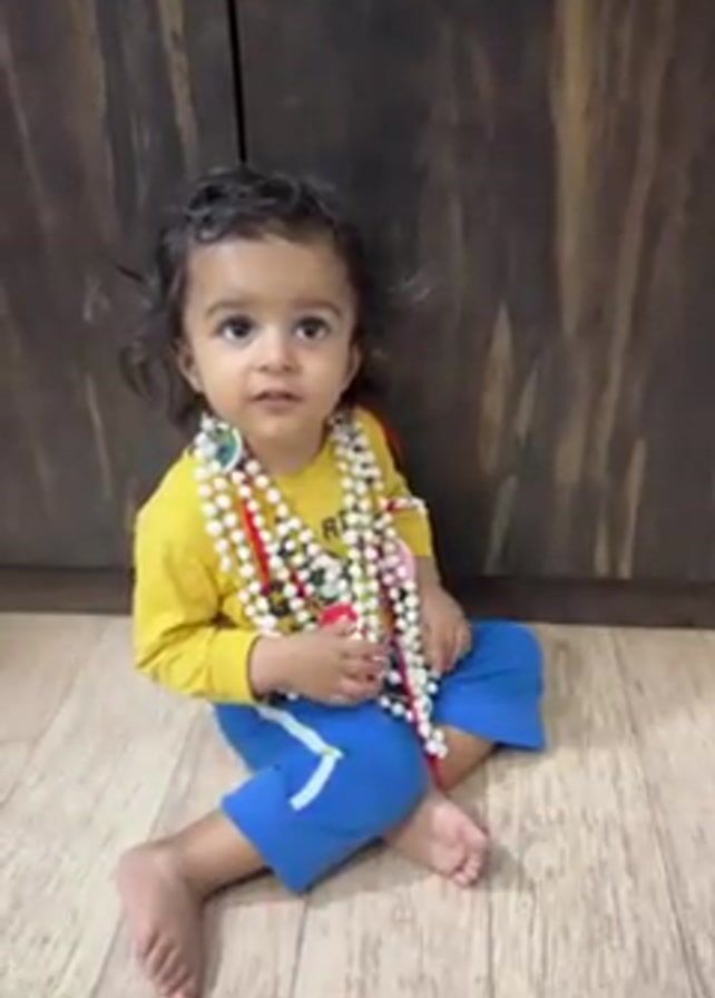 A barefoot toddler with curly brown hair sits cross-legged on a light-colored wooden floor. The toddler, wearing a yellow long-sleeved shirt and blue shorts with a white stripe down the side, is adorned with several strands of white beads around their neck. The toddler holds a red and white object in their hands and looks directly at the camera. A dark brown wooden cabinet is visible in the background. The person speaks and directs the toddler to smile.