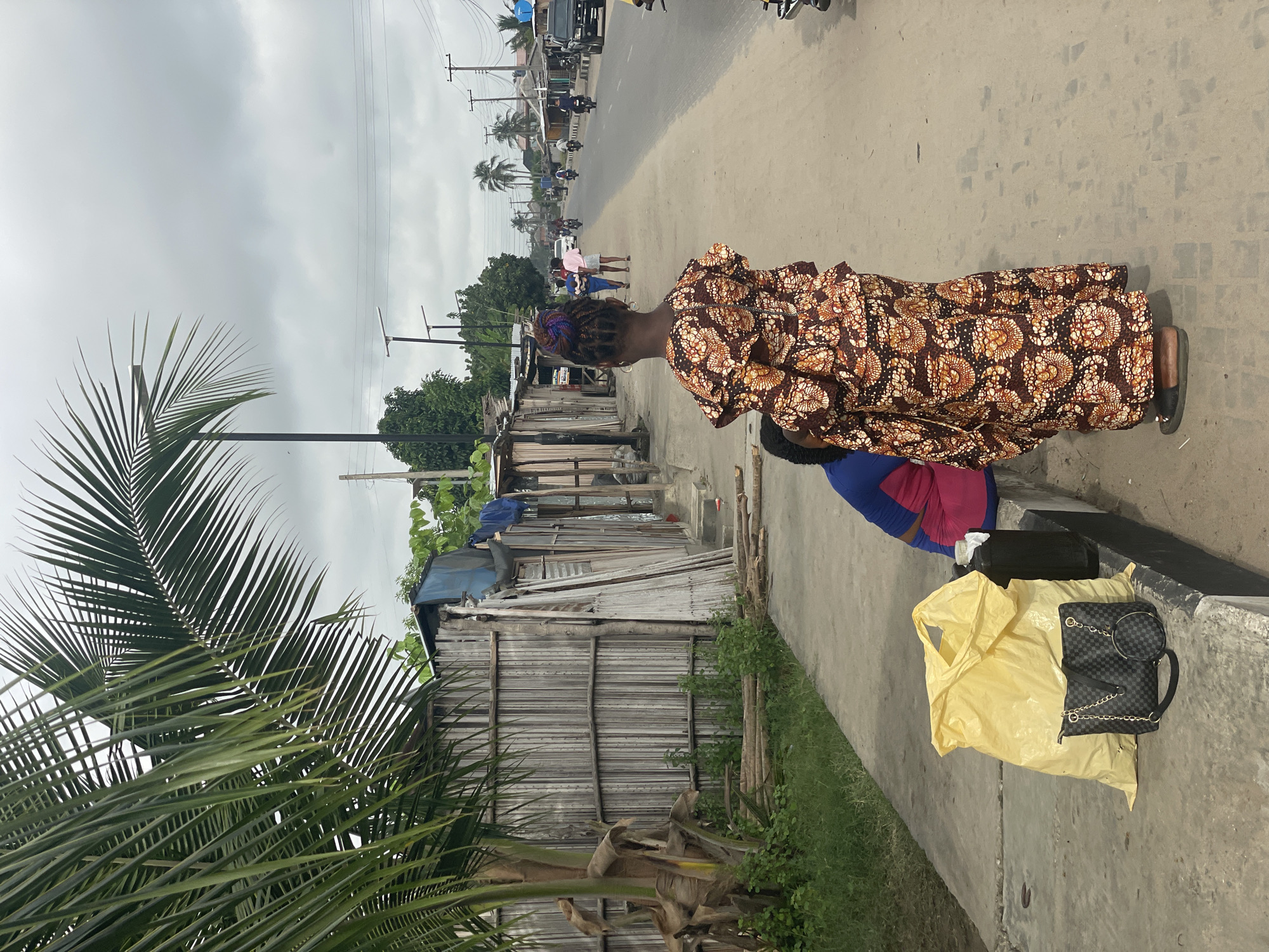 In Badagry, Nigeria, a woman in a brown patterned dress and braided hair stands on a concrete sidewalk beside a road. She is next to a younger person in a blue and red shirt. A yellow bag and a black purse sit on the ground nearby. Behind them are weathered, wooden structures. A palm tree is in the foreground, and a road with cars and people stretches into the distance under a cloudy sky.