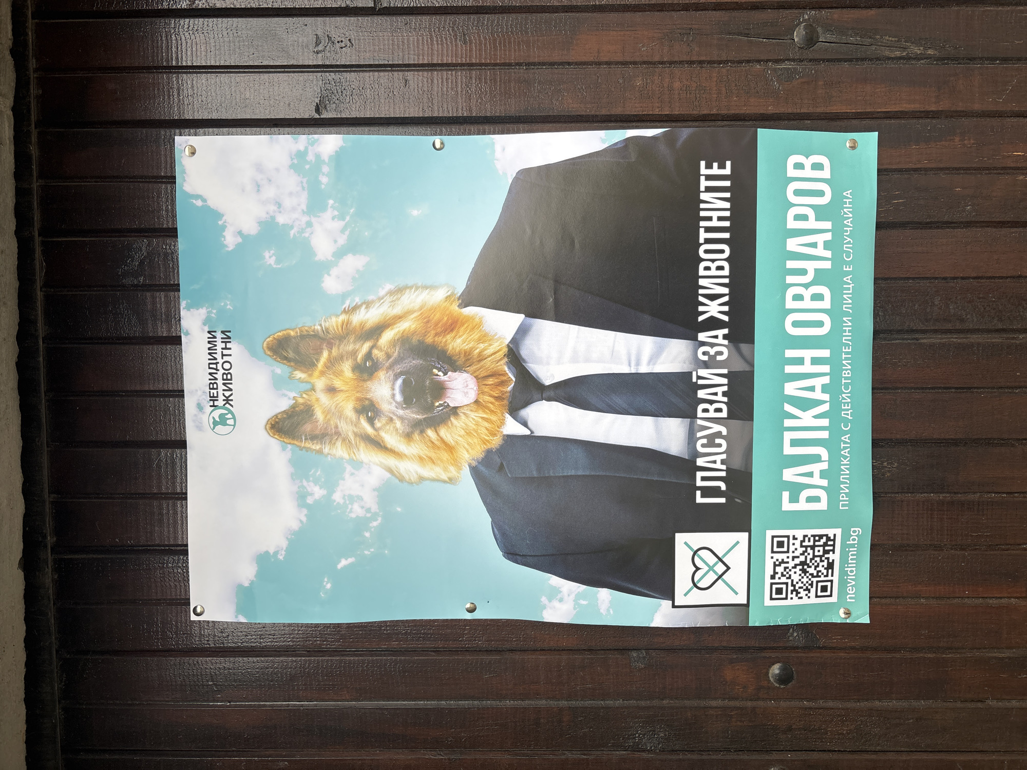 A poster is attached to a dark wooden door. The poster is an advertisement with the head of a German Shepherd dog superimposed on a business suit against a sky with scattered clouds. Text in Bulgarian is present on the poster. The poster is likely located in Sofia, Bulgaria, given the language.