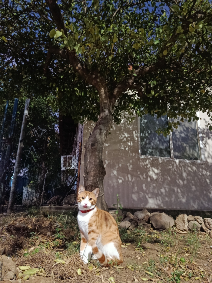 This image, captured in Altagracia, Venezuela, depicts an outdoor scene focusing on a domestic cat. In the foreground, an orange and white tabby cat is seated on disturbed earth, directly facing the camera with its tongue slightly extended. The cat wears a red collar. Behind the cat, a mature tree with a light brown, gnarled trunk and dense green foliage dominates the central frame, providing shade. To the left of the tree, a chain-link fence with some vertical posts is visible, partially obscured by darker foliage and shadows. Beyond the fence, a white utility box is faintly discernible on a darker background. To the right of the tree, a light-colored building with two rectangular windows reflects light, and distinct dappled shadows from the tree's leaves are cast upon its exterior wall. The ground consists of bare soil, dry leaves, sparse green vegetation, and several small rocks near the base of the building. The scene is illuminated by what appears to be natural daylight, creating strong contrasts and shadows.