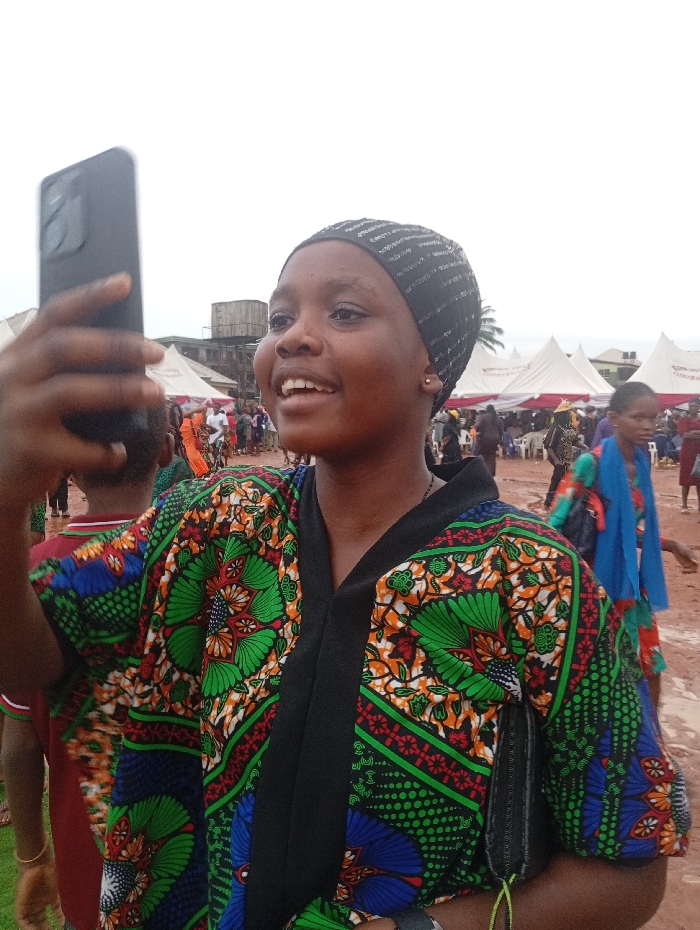 A young individual, located in the city of Akpaka Forest Reser, Nigeria, is captured in a medium close-up, smiling with an open mouth and looking slightly to their left. They wear a black patterned head covering and a vibrant, multi-colored garment featuring green, blue, orange, and red patterns on a dark background, accented with black trim. Their right hand holds a black smartphone vertically, positioned as if recording or photographing. A small stud earring is visible in their left ear. A black strap or bag hangs from their left shoulder. The background reveals an outdoor gathering with multiple white canopies featuring red accents. The ground is reddish-brown earth. Various individuals are present in the mid-ground and background, and a building with a dark water tank is visible in the distant left. The sky is overcast.