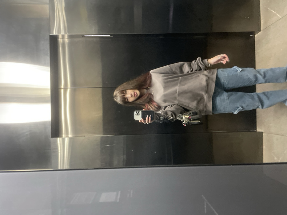 The scene depicts a young female individual taking a mirror selfie inside an elevator, located in the city of Hod HaSharon, Israel. The individual stands centrally, possessing long brown hair with bangs and reddish undertones, and is dressed in a grey oversized hooded sweatshirt and light blue cargo pants. Her right hand, raised, holds a silver-colored smartphone with a black case, pointed towards the reflective surface. A keychain with multiple metallic keys is suspended from her left hand, positioned lower. Her fingernails are elongated and painted a light, possibly white, color. The elevator's background consists of closed, brushed stainless steel doors, flanked by dark, reflective wall panels. The floor is not clearly discernible.