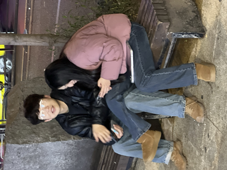 A couple is sitting on a park bench. The man is wearing a black leather jacket and glasses. The woman is wearing a pink puffer jacket and has long black hair. Both are wearing jeans and tan boots. The man is holding a vape pen in his hand. The scene appears to be at night, illuminated by streetlights.