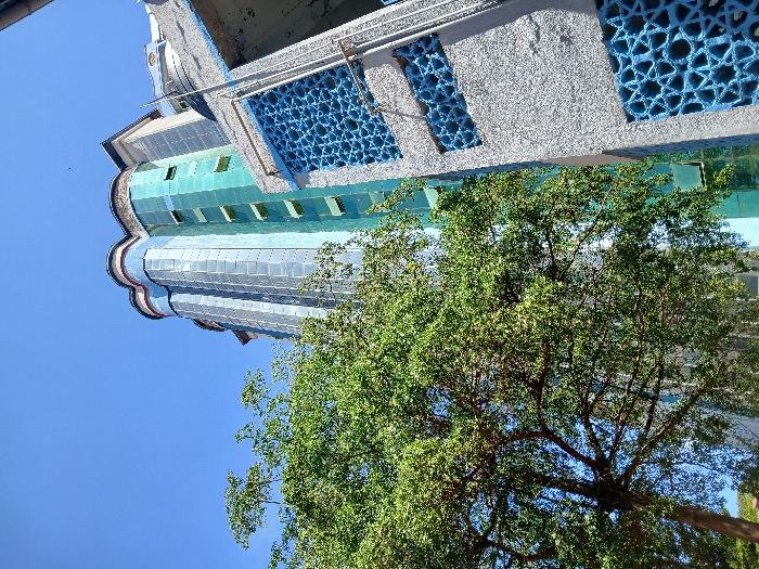 An upward-angled photograph captures a multi-story building located in Thika, Kenya, under a clear, bright blue sky. A large, mature deciduous tree with dense green foliage occupies the lower-left and central foreground, partially obscuring the primary structure. The main building exhibits a facade composed of segmented, vertically-curved units; the leftmost units are faced with reflective panels displaying a silvery-blue hue, while the units to the right are faced with reflective panels of a teal-green color, each containing multiple small, dark, rectangular windows. The uppermost section of the building includes a decorative frieze incorporating reddish-brown and blue elements. To the immediate right, a secondary, grey-textured building is partially visible. This structure features at least three recessed rectangular apertures, each filled with an intricate blue geometric lattice screen. Vertical conduit lines are affixed to its exterior. No individuals or specific activities are present within the frame.